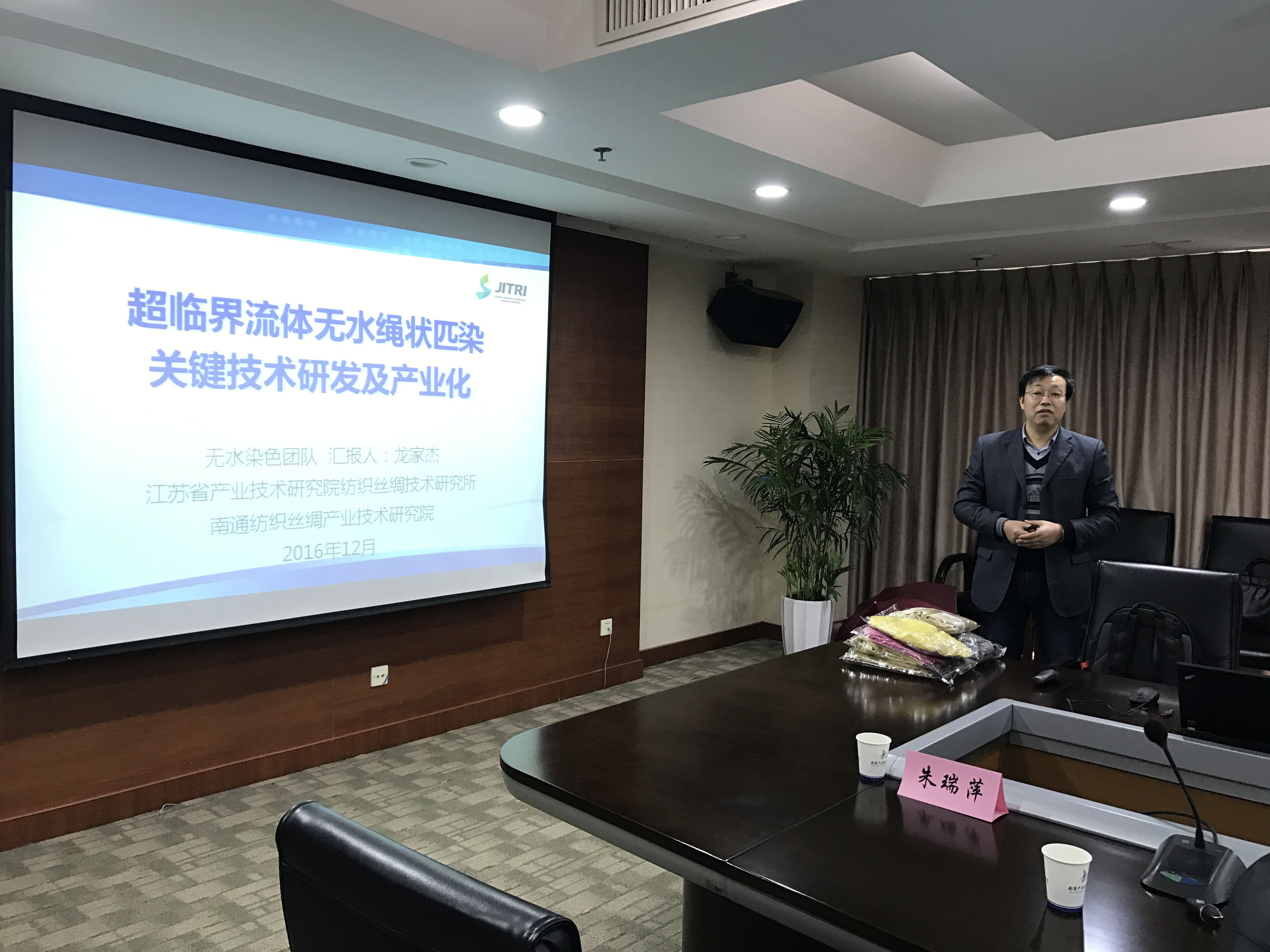 龙家杰教授介绍了《超临界CO2无水生态染色关键技术研发及产业化》项目的研究情况,此项目主要创新点及优势有:在国际上首次实现了超临界CO2高压系统中松式绳状织物匹染,实现绳状织物与流体的双重可控循环,并解决了匹染织物的不匀性问题,开发了超临界CO2流体无水绳状中试染色工艺。目前该项目的研究已进入中试阶段。