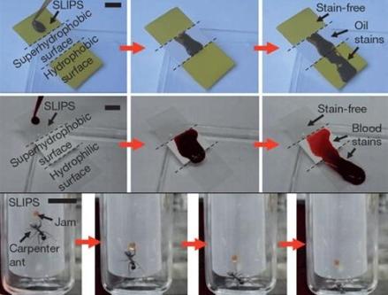 从这张图就能看出它的效果,对比起旁边的超疏水和疏水材质,可以明显看出这SLIPS材料真的就是什么都不沾,连蚂蚁都趴不住,给力。