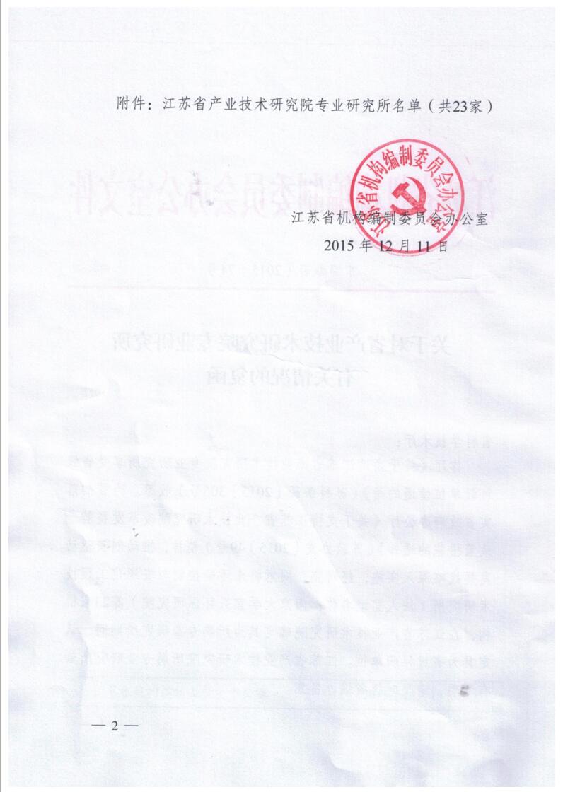 关于对省产业技术研究院专业研究所有关情况的复函 苏编办函[2015]74号 认定省级科研单位