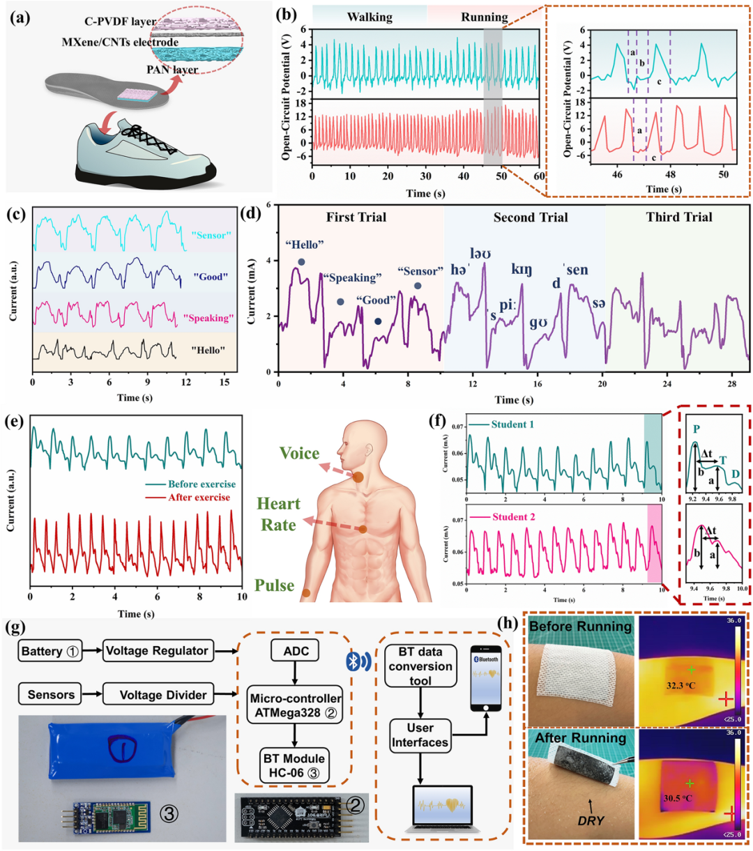 此外,基于DMWES的单电极摩擦电机可以提供21.6 μW/m2的高面功率密度和良好的循环稳定性。凭借卓越的压力传感和摩擦电性能,DMWES 可以实现全方位的医疗传感,包括精确的脉搏监测、语音识别和手势传感。