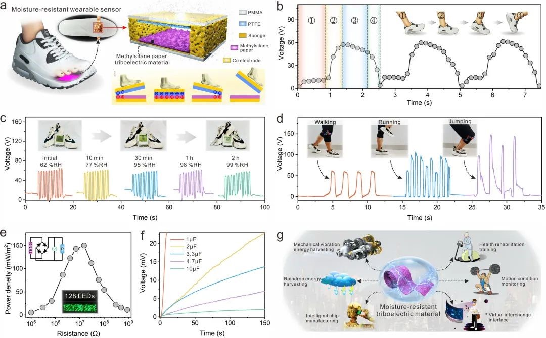 通过水蒸气透过率实验和湿重检测推测,该纤维素摩擦电材料上的疏水甲基是抵抗湿空气干扰的关键。结合高湿度环境下的自供电性能检测,发现所制备的纤维素摩擦电材料较传统材料抗湿性能提升了4倍。